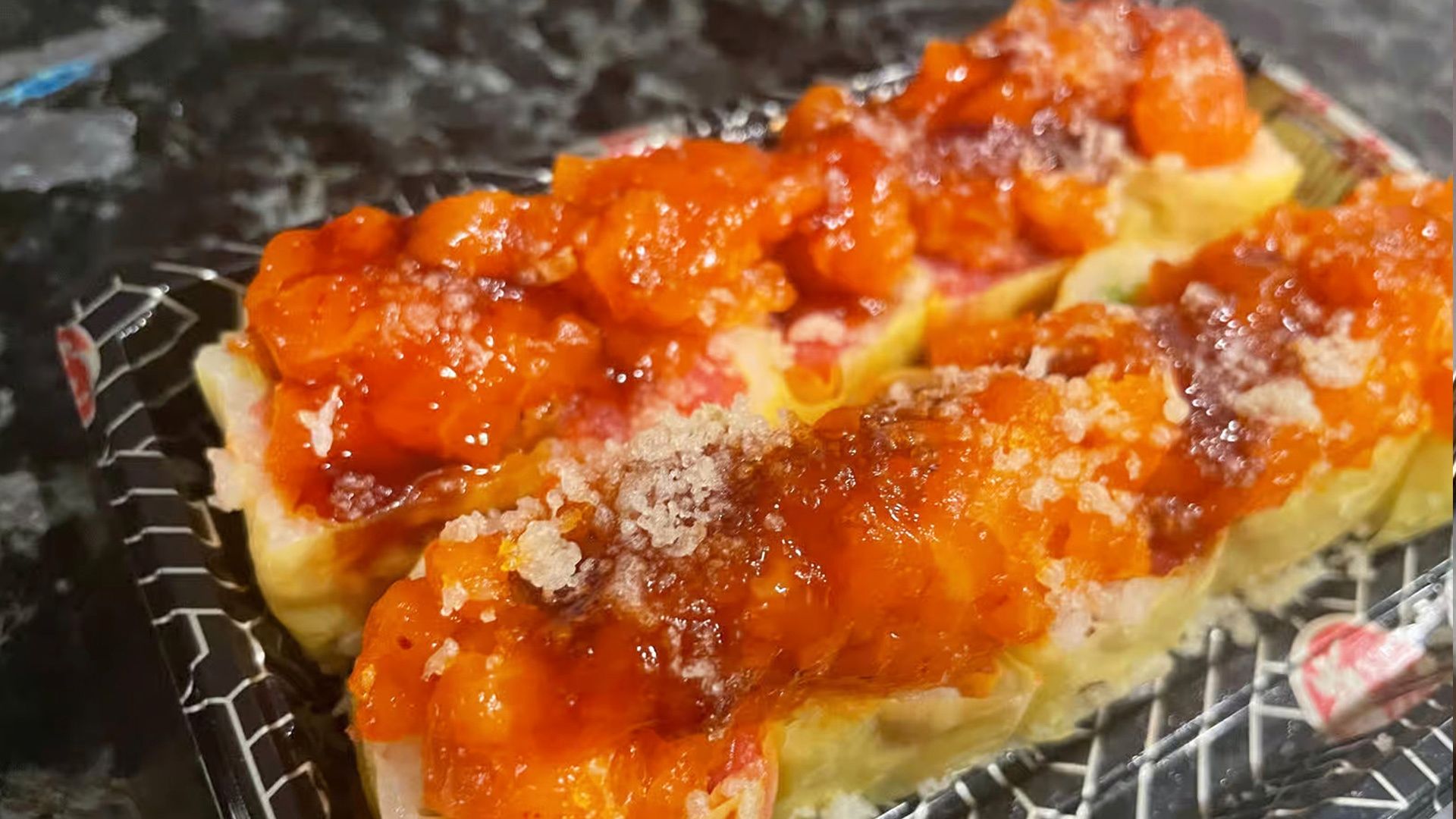 Tempura style spicy crawfish, jalapeno, topped with shrimp, crab salad, eel sauce, and red & green fish egg(8)