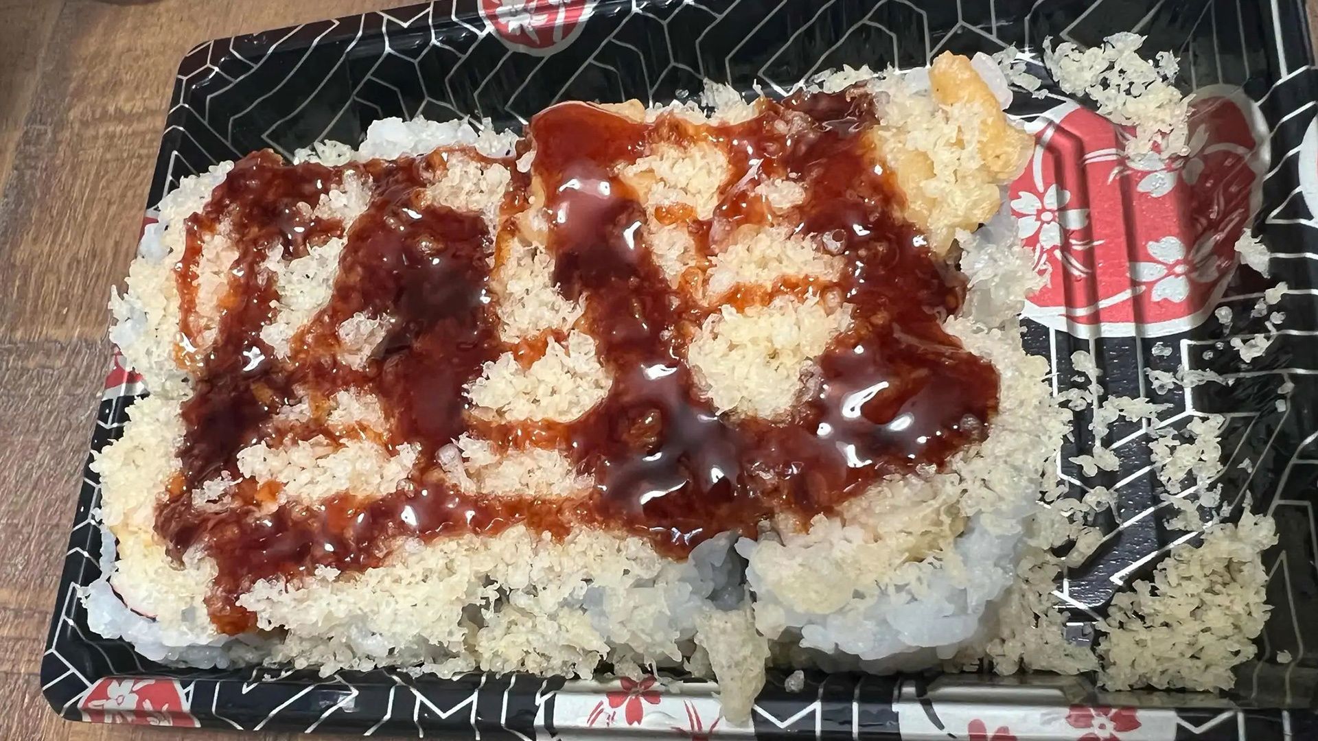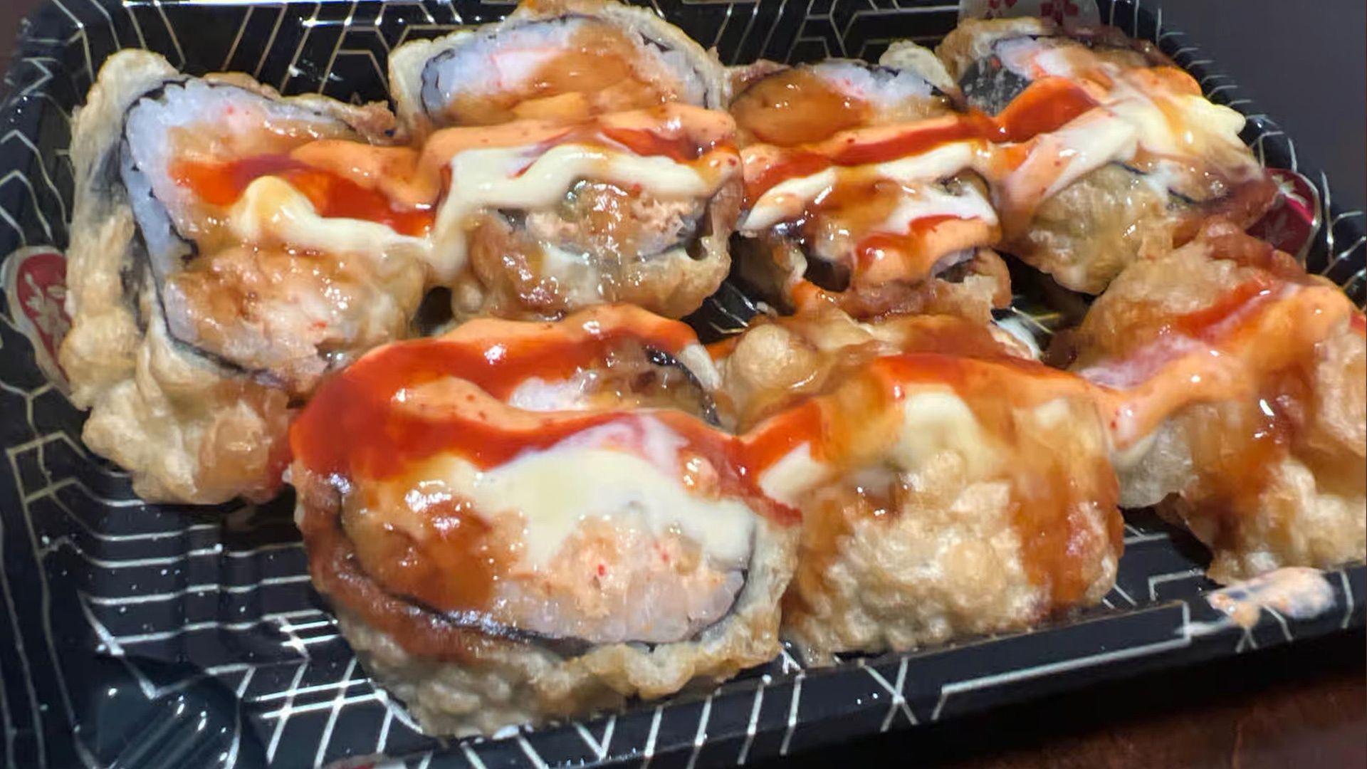 Shrimp tempura inside, crab topped with spicy mayo, eel sauce and Japanese mayo.(8)